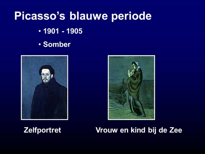 Deze periode in de schilderkunst van Picasso staat bekend als de ‘blauwe periode’. Hij maakte sombere schilderijen in donkere, voornamelijk blauwe kleuren.